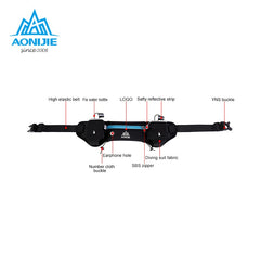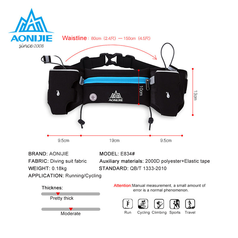 Gender: MenSize: LApplication Position: WaistMaterial: NylonModel Number: E834Brand Name: AONIJIEGender: UnisexColor: Black, Blue, Green, RedUsed for: running, cycling, camping, hiking, travel etc.Style: Waist PackFeature: Reflective Stripe, Bottle Holder
